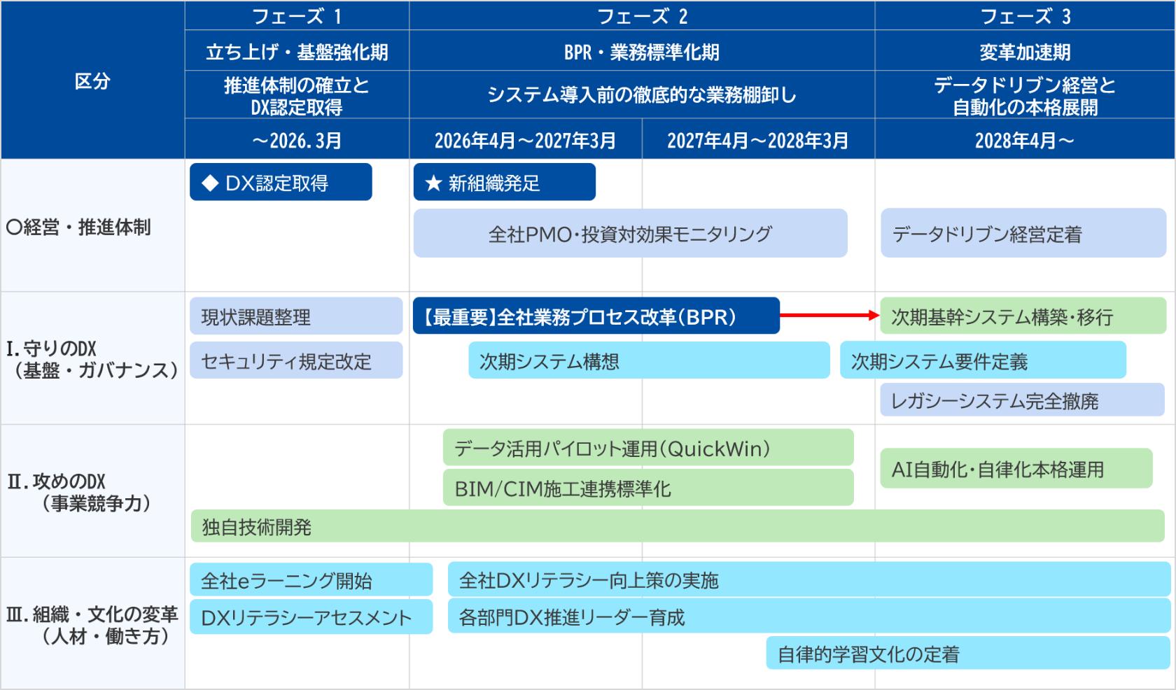 - 守りのDX(基盤強化): データのサイロ化を解消し、迅速な意思決定を可能にする「データドリブン経営」へ転換します。