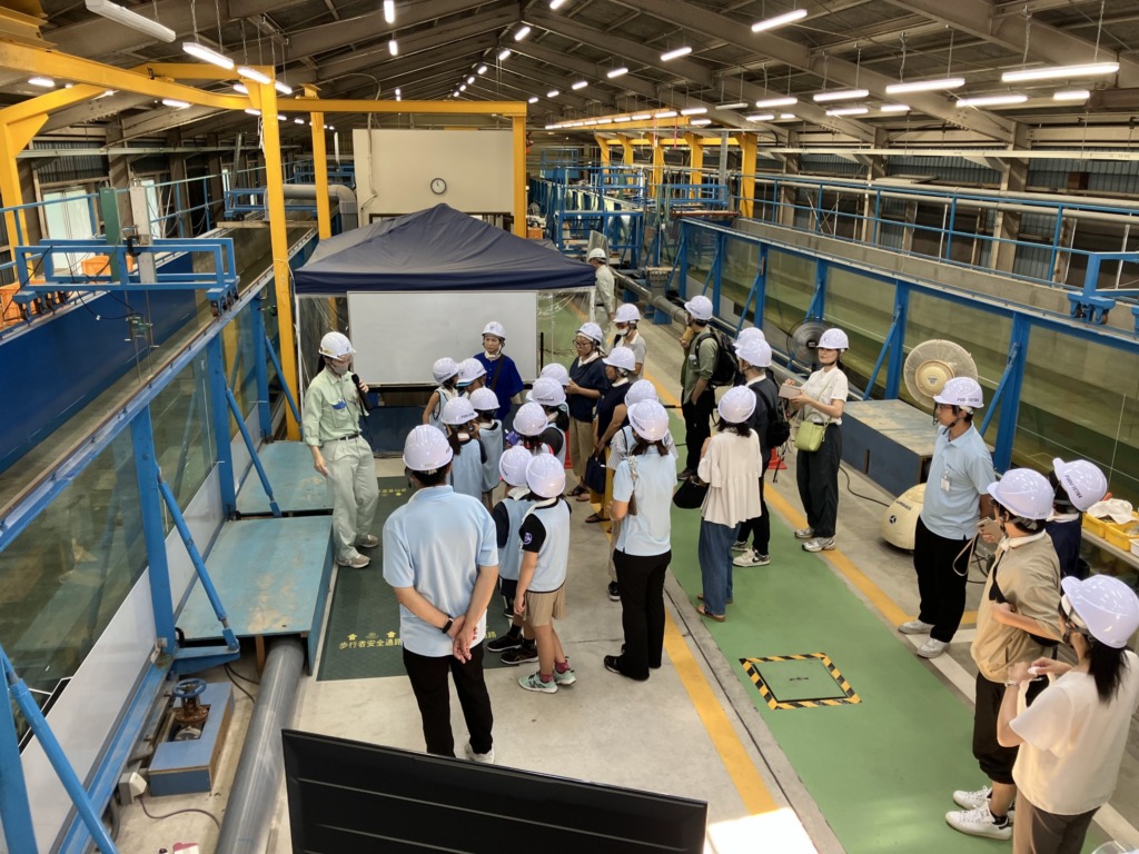 子どもたちはキッズ研究員として、最初にテトラポッドの役割や自然災害について学習し、石膏を使用したブロック製作を体験。実験棟で断面水槽、平面水槽の見学を行った後は、実際に波を発生させた小さな水槽に一つひとつブロックを据え付けて消波効果の確認を行い、最後には研究レポートを作成しました。子どもたちや保護者の皆さんからは、「テトラポッドの図鑑を作成したい」「波を弱くすることがすごい!!と思いました」等の感想をいただきました。