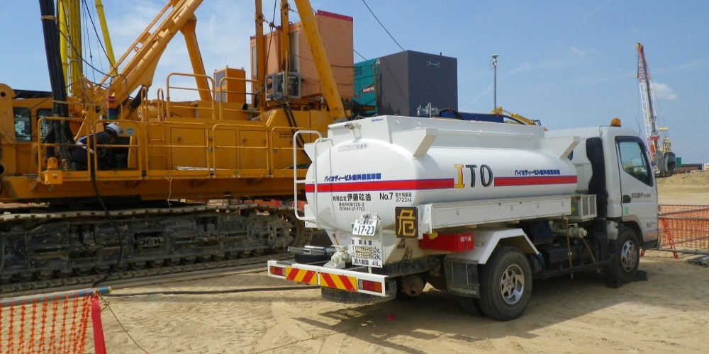 株式会社不動テトラ(代表取締役社長 奥田眞也)は、事業主:株式会社デンソー様、元請会社:大成建設株式会社様のご協力のもと、「善明南新工場新設工事」の地盤改良工事(深層混合処理工法:CI-CMC工法を採用)で使用するすべての建設機械燃料にバイオ燃料混合軽油となる「B5軽油」を使用しました。地盤改良工事で使用燃料を全面的に「B5軽油」に切り替えたのは日本初となります。(当社調べ)