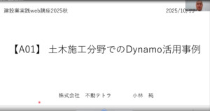 講演テーマは「土木施工分野におけるDynam※の活用事例」で、Dynamo講習会を実施している株式会社大塚商会と共同でDynamoの取り組み事例を紹介し、当社からはBIM/CIMによる施工管理にDynamoを活用した事例をはじめ、Dynamoを利用したシステム開発、今後のDynamoの展望等を説明しました。